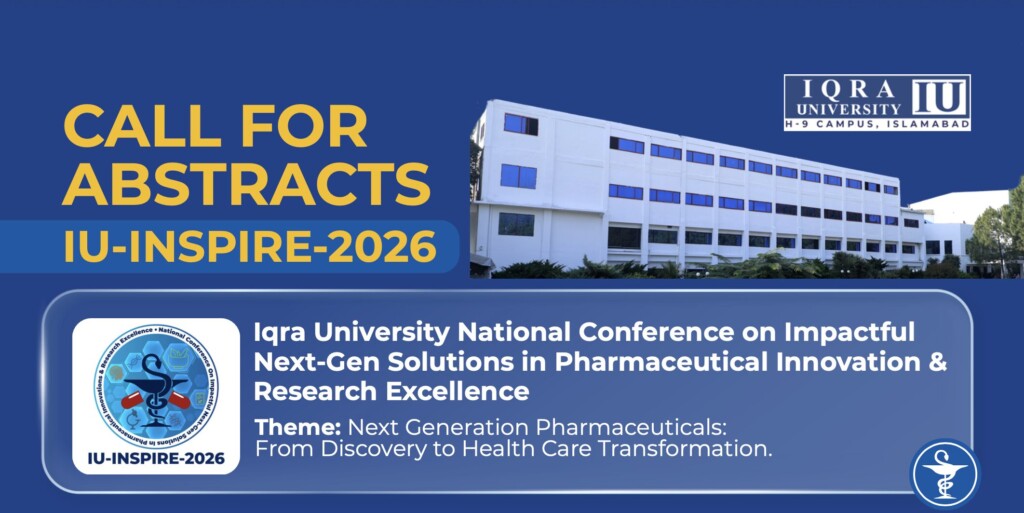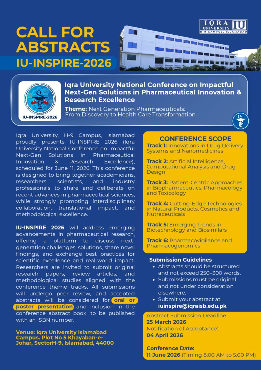 Iqra University, H-9 Campus, Islamabad proudly presents IU-INSPIRE 2026 (Iqra University National Conference on Impactful Next-Gen Solutions in Pharmaceutical Innovation & Research Excellence), scheduled for June 11, 2026. All submissions will undergo peer review, and accepted abstracts will be considered for oral or poster presentation and inclusion in the conference abstract book
